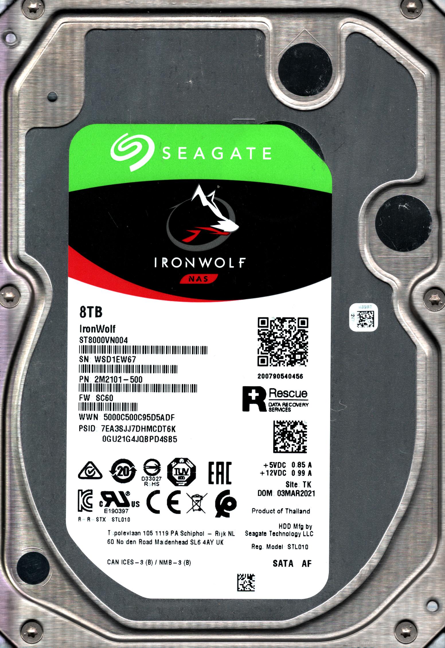 ST8000VN004 P/N: 2M2101-500 F/W: SC60 S/N: WSD1E 8TB MAR 2021 THAILAND SEAGATE