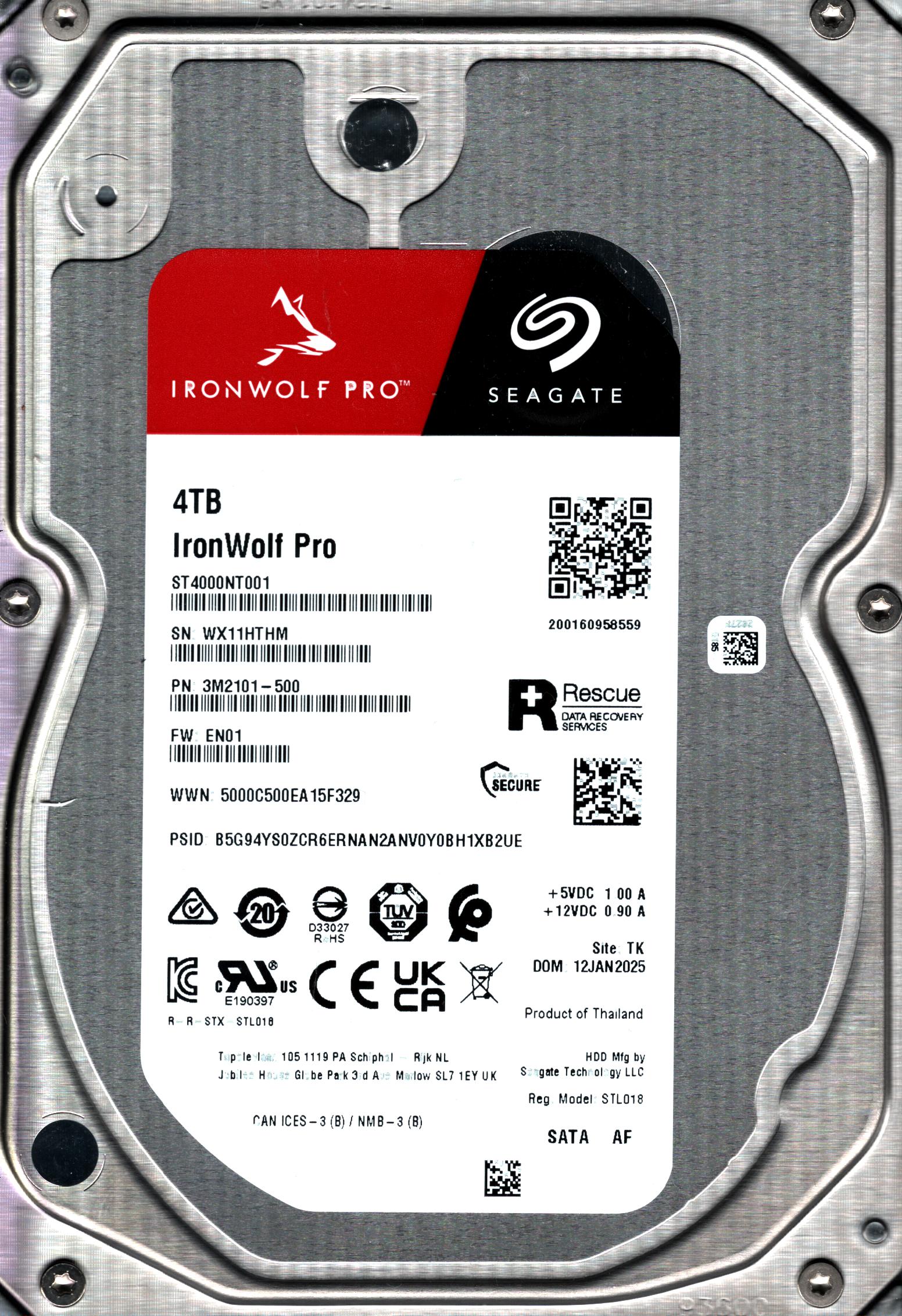 ST4000NT001 P/N: 3M2101-500 F/W: EN01 S/N: WX11H 4TB JAN 2025 THAILAND SEAGATE