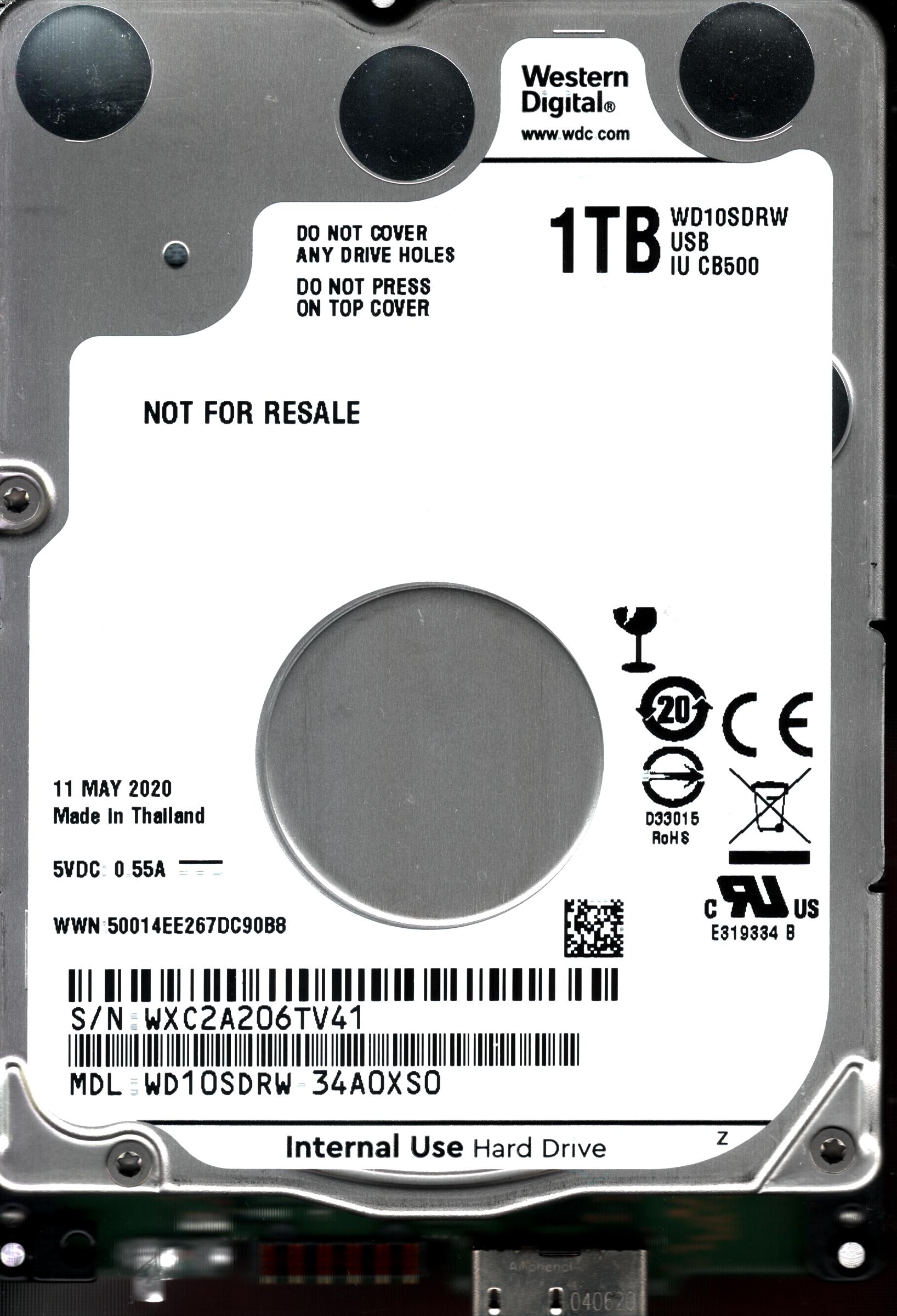 WD10SDRW-34A0XS0 S/N: WXC2A WESTERN DIGITAL 1TB THAILAND MAY 2020