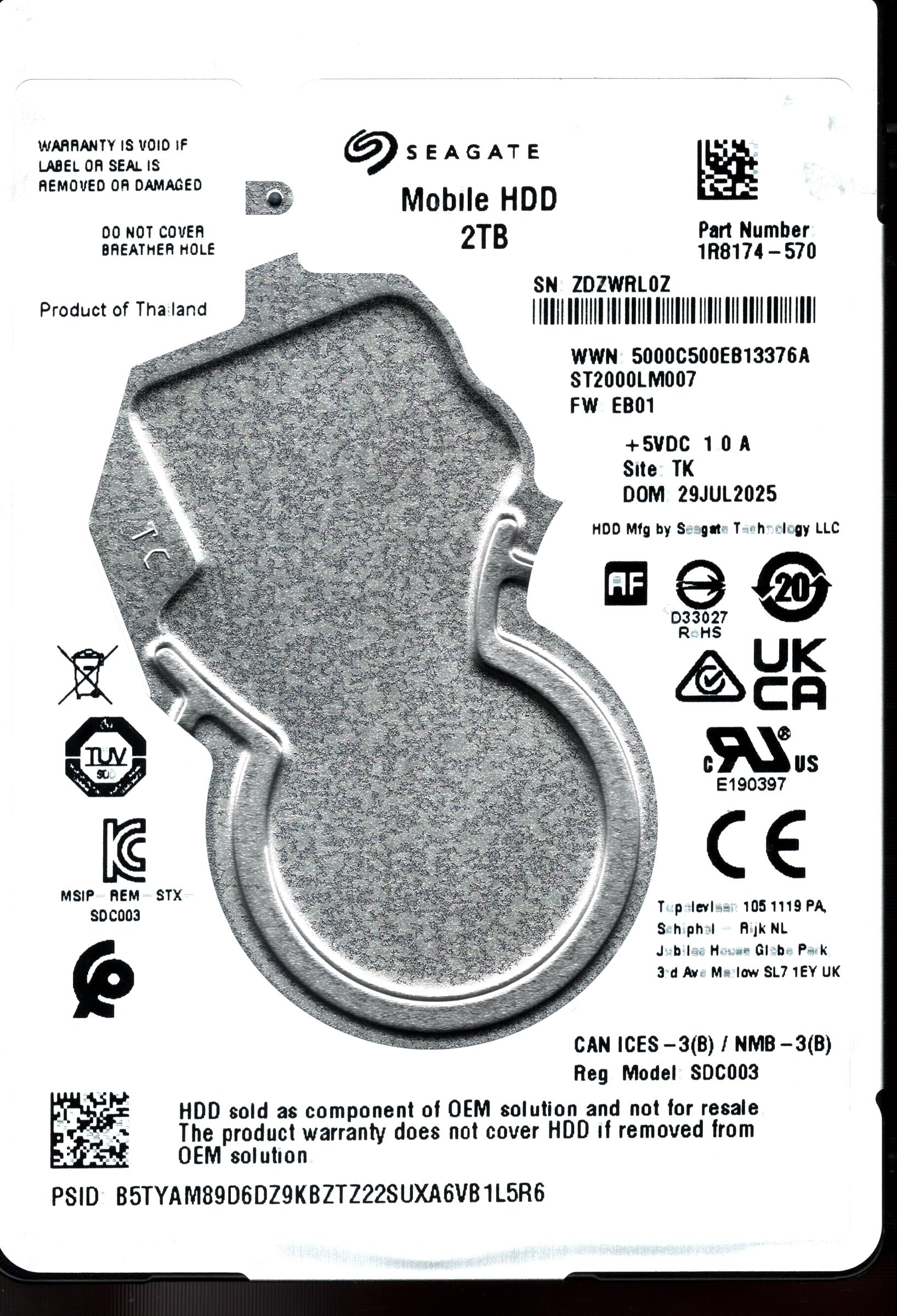 ST2000LM007 P/N: 1R8174-570 F/W: EB01 S/N: ZDZWR 2TB JUL 2025 THAILAND SEAGATE
