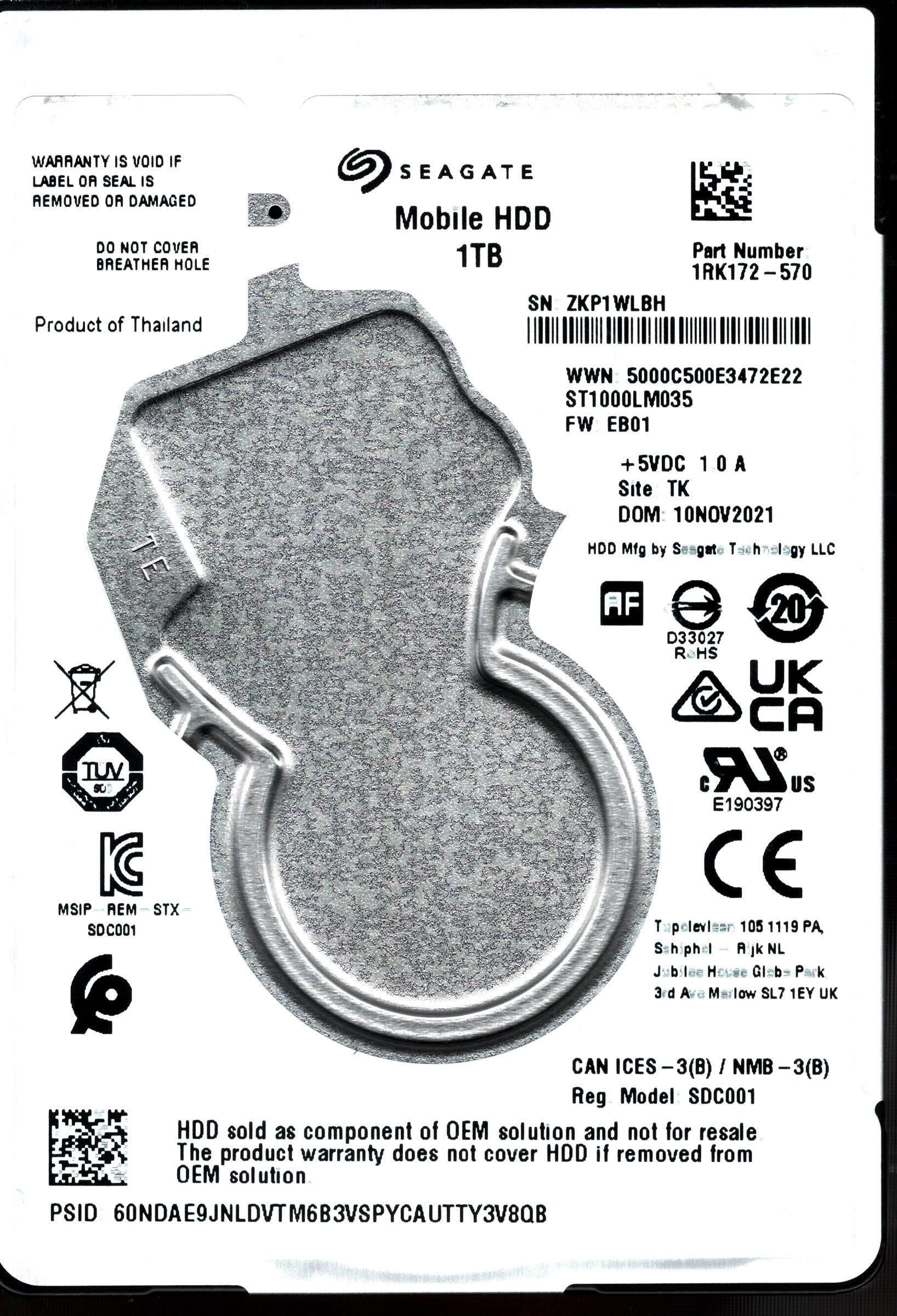 ST1000LM035 P/N: 1RK172-570 F/W: EB01 S/N: ZKP1W 1TB NOV 2021 THAILAND SEAGATE