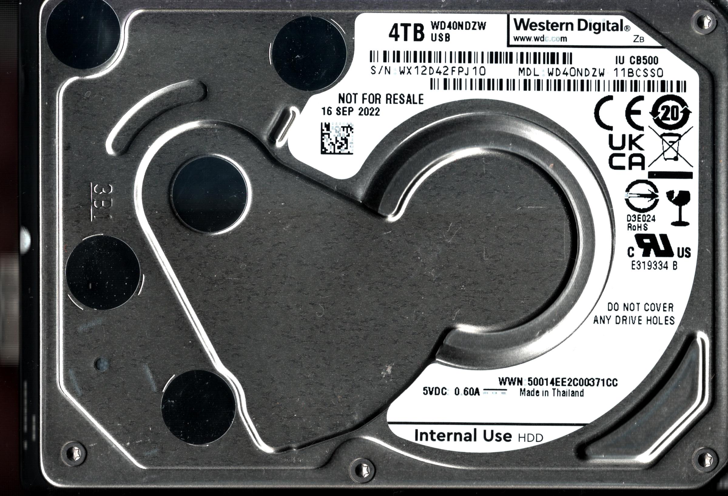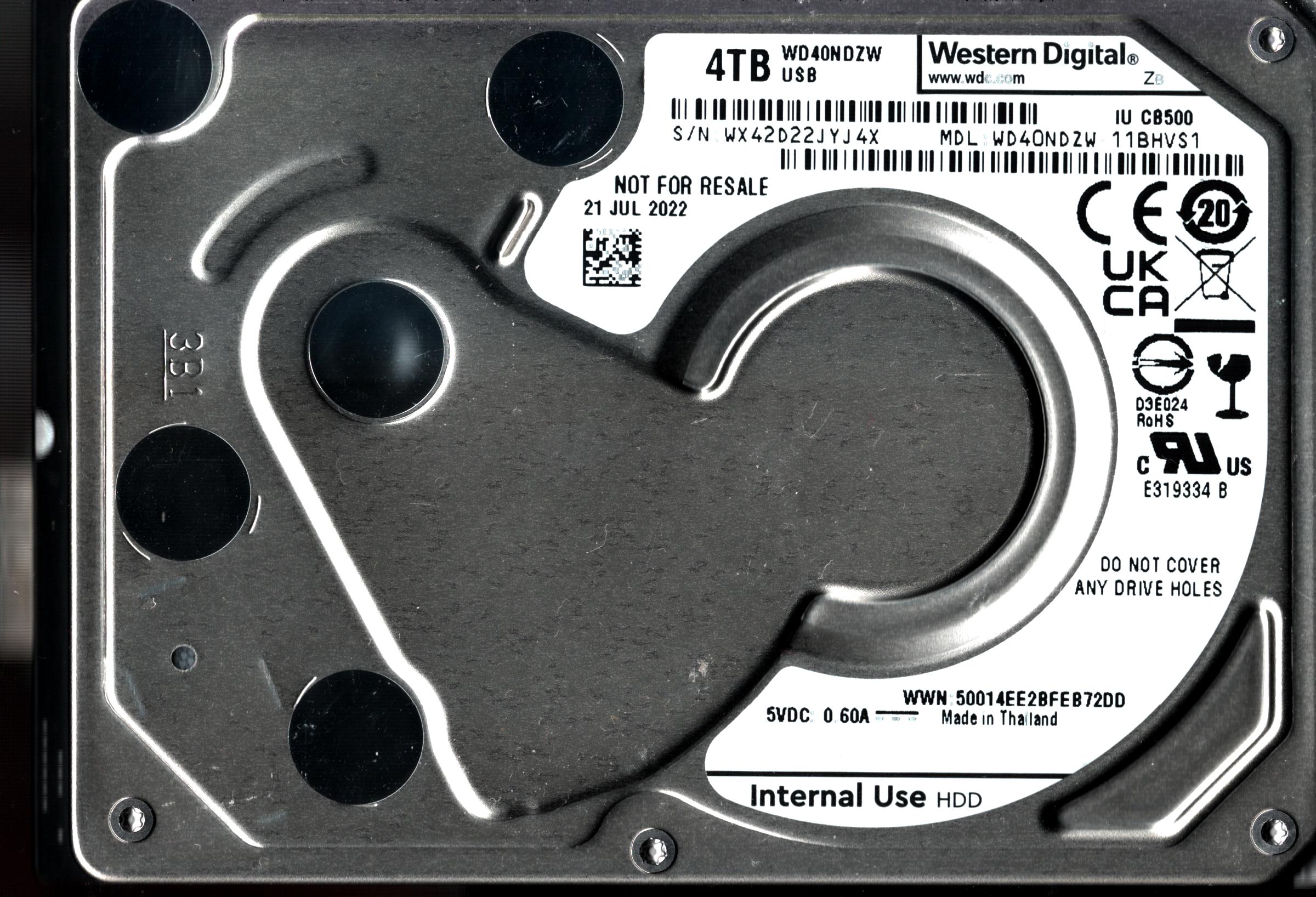 WD40NDZW-11BHVS1 S/N: WX42D WESTERN DIGITAL 4TB THAILAND JUL 2022
