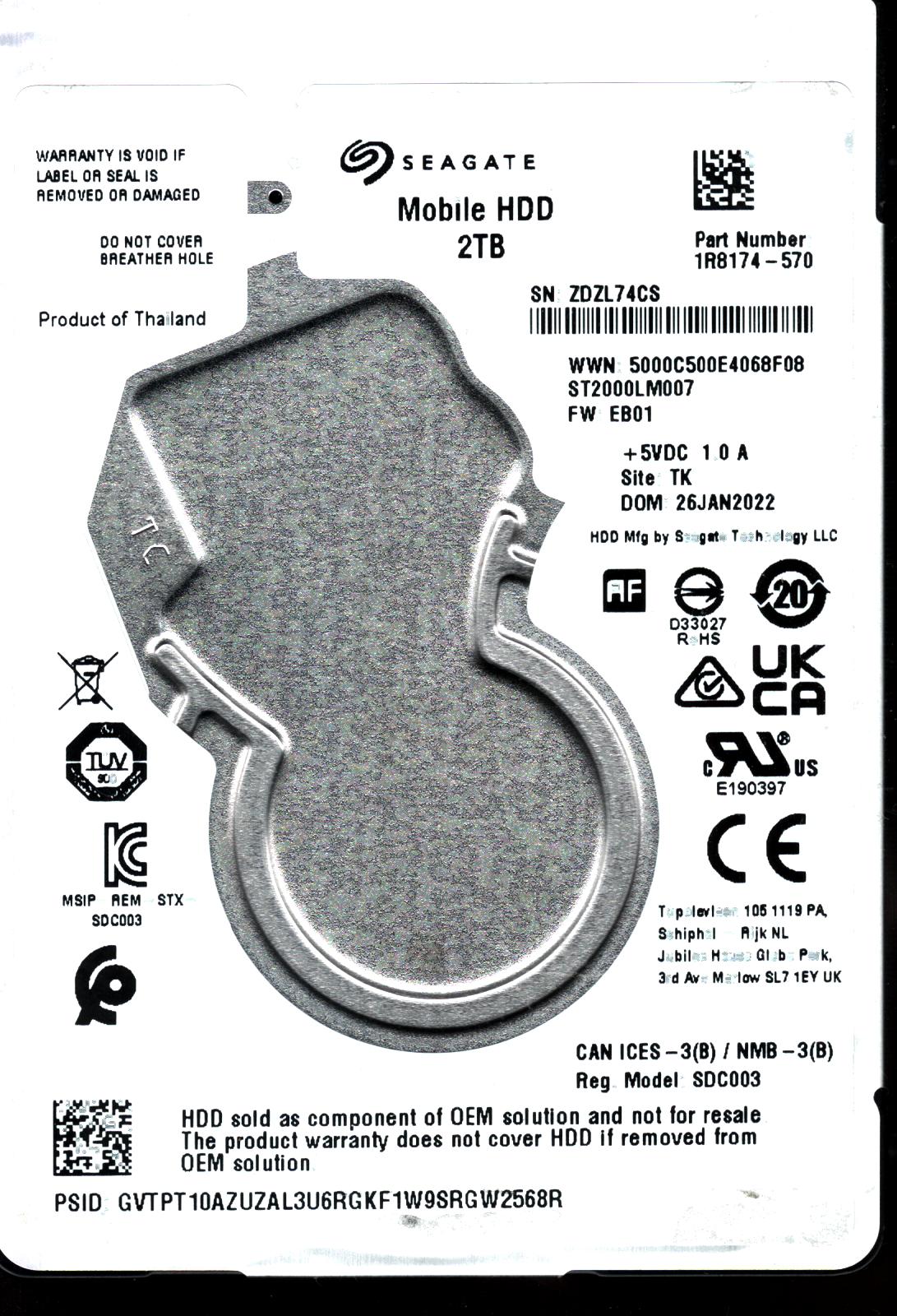 ST2000LM007 P/N: 1R8174-570 F/W: EB01 S/N: ZDZL7 2TB JAN 2022 THAILAND SEAGATE
