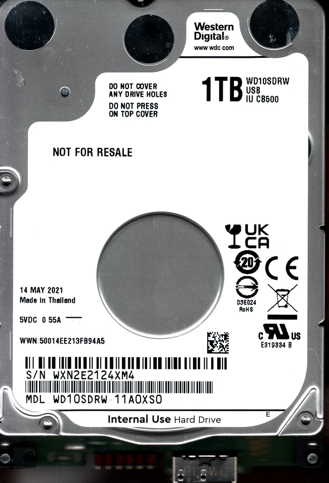 WD10SDRW-11A0XS0 S/N: WXN2E WESTERN DIGITAL 1TB THAILAND MAY 2021