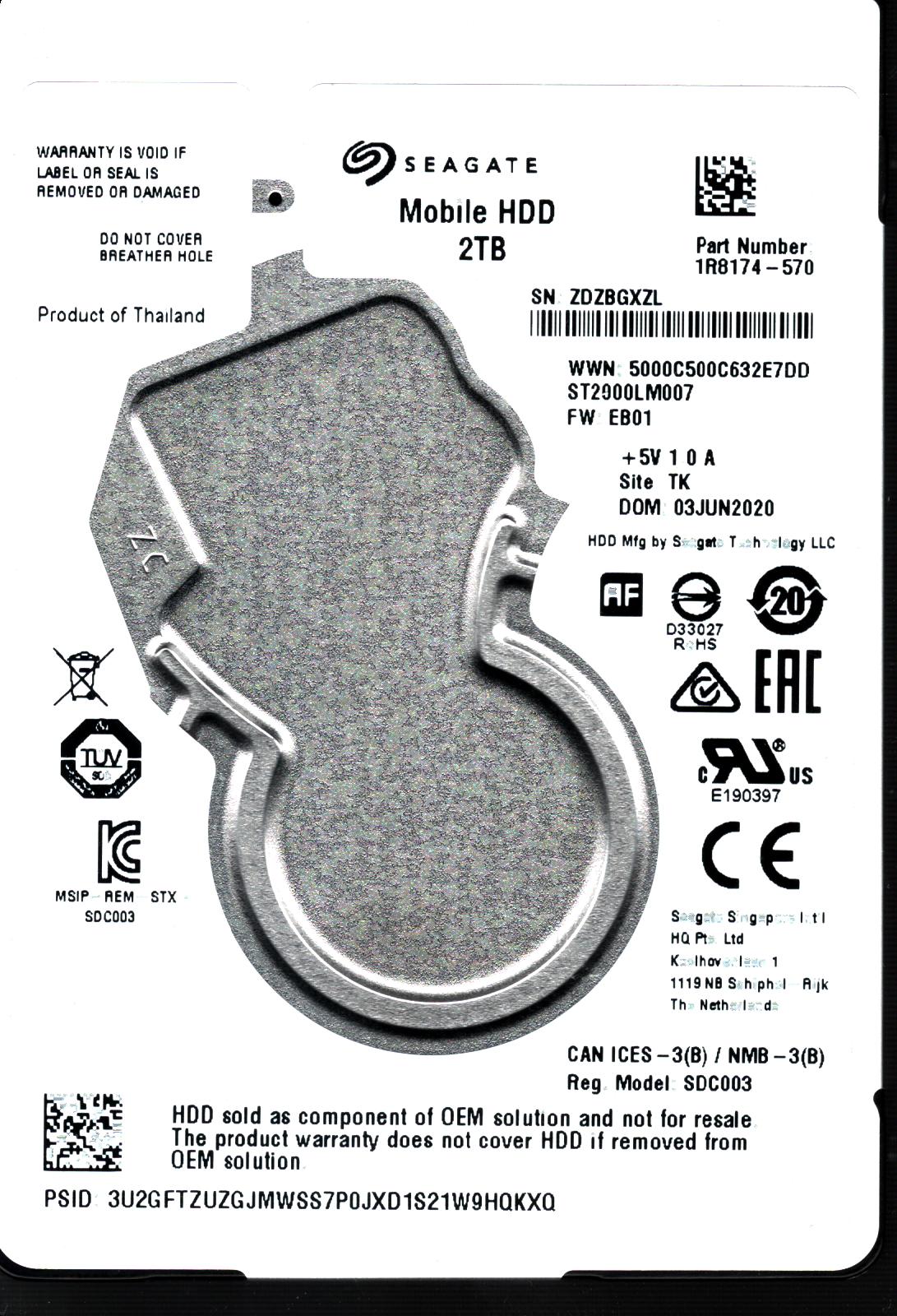 ST2000LM007 P/N: 1R8174-570 F/W: EB01 S/N: ZDZBG 2TB JUN 2020 THAILAND SEAGATE