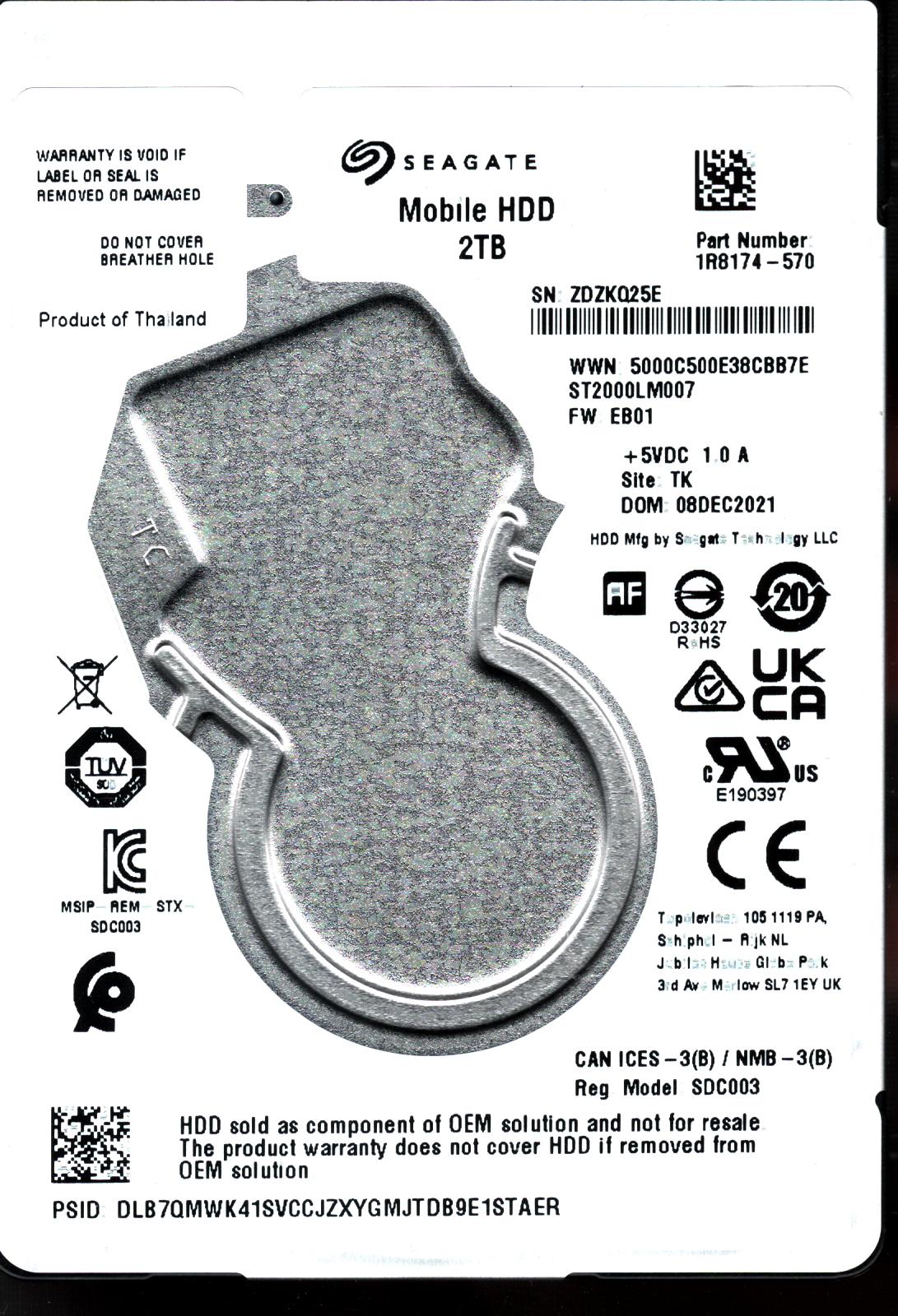 ST2000LM007 P/N: 1R8174-570 F/W: EB01 S/N: ZDZK0 2TB DEC 2021 THAILAND SEAGATE