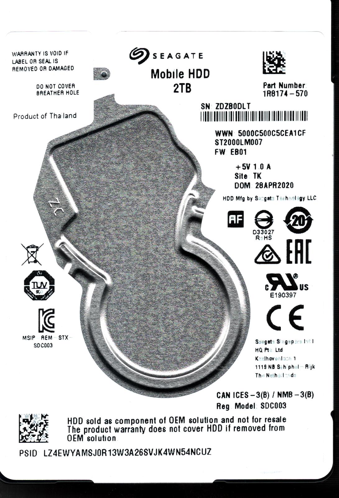 ST2000LM007 P/N: 1R8174-570 F/W: EB01 S/N: ZDZB0 2TB APR 2020 THAILAND SEAGATE
