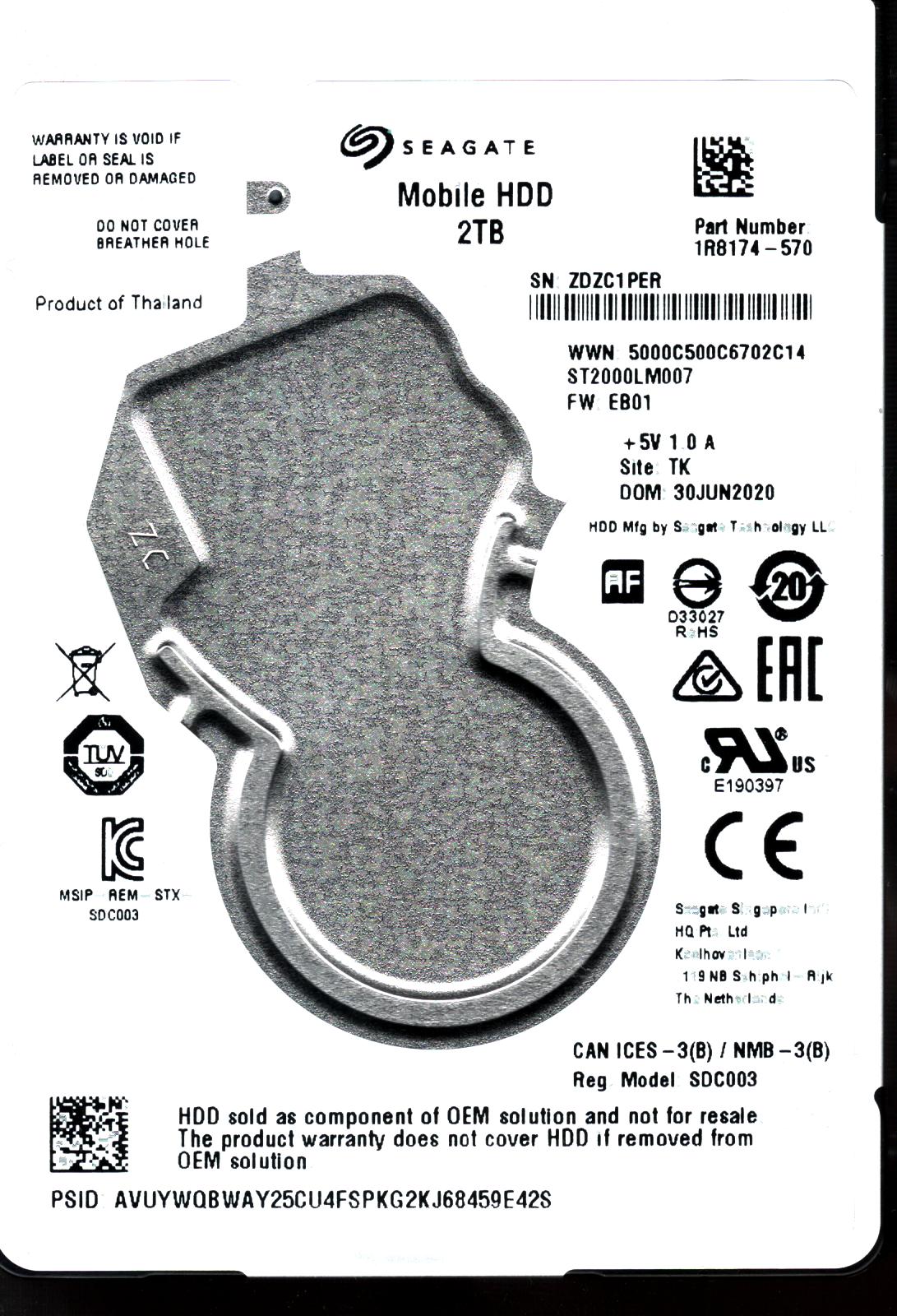 ST2000LM007 P/N: 1R8174-570 F/W: EB01 S/N: ZDZC1 2TB JUN 2020 THAILAND SEAGATE