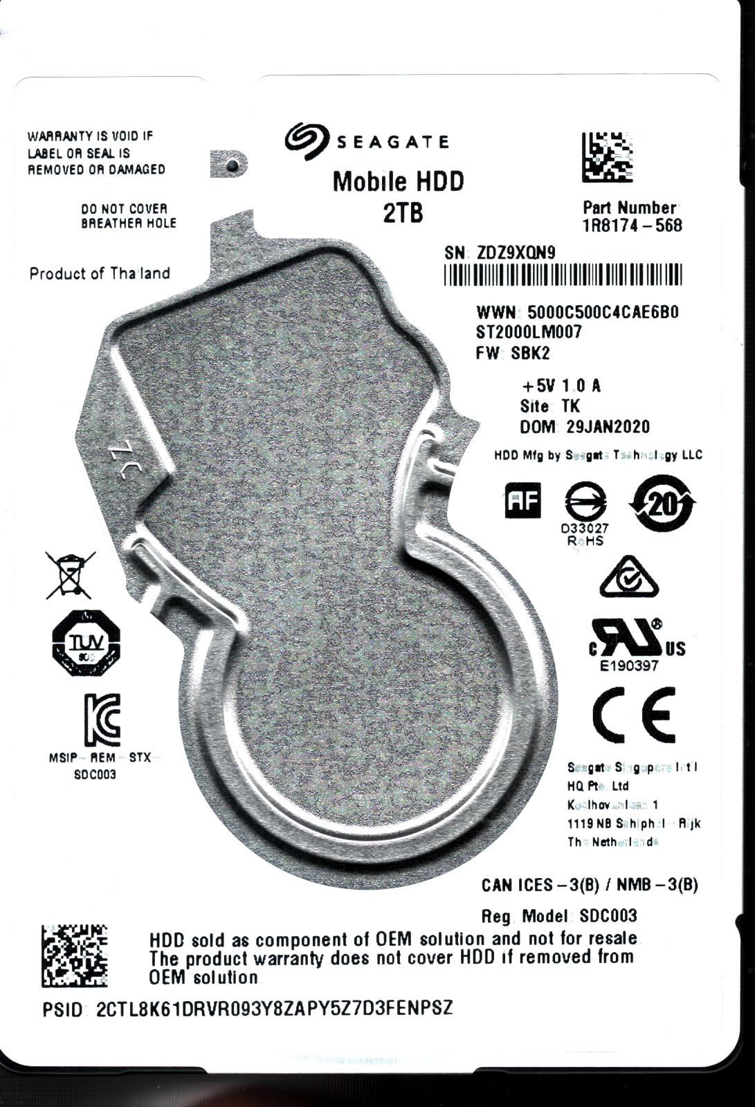 ST2000LM007 P/N: 1R8174-568 F/W: SBK2 S/N: ZDZ9X 2TB JAN 2020 THAILAND SEAGATE